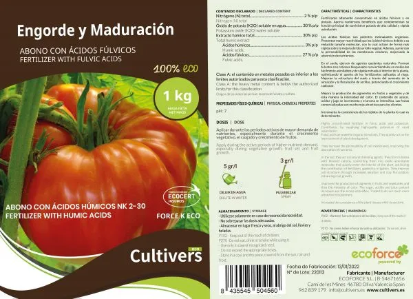 Abono Engorde y Maduración es un Fertilizante altamente concentrado enácidos fúlvicosy en potasio. Aporta numerosos beneficios que complementan su función principal de suministrar potasio de alta calidad y rápida asimilación.