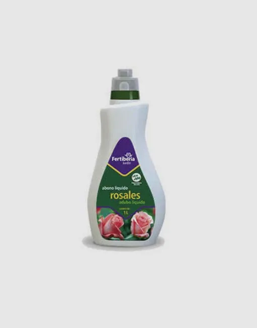 Abono líquido para rosales de la marca Fertiberia, formulado especialmente para todo tipo de rosales, arbustos de flor y plantas trepadoras tales como buganvilla, madre selva, hiedra, etc.