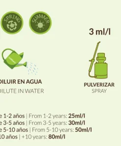 - Riego: Diluir en agua: De 1-2 años 20 ml/l; De 3-5 años; 40ml/l De 5-10 años 60ml/l; +10 años: 80ml/l