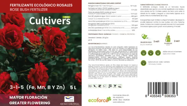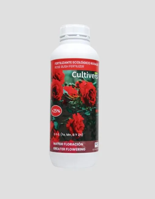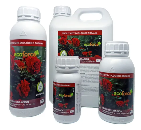 Abono Rosales Líquido Ecológico. El fertilizante ecológico rosales es un formulado líquido desarrollado para aportar una nutrición equilibrada a los rosales y otras plantas de flor. Contiene quelato de hierro para evitar la clorosis de los rosales y asegurar un crecimiento vigoroso de la planta. Evita el amarillamiento de la hoja.