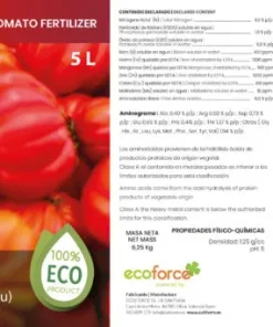 Abono Tomates Líquido Ecológico. El fertilizante ecológico tomate es un formulado orgánico de acción inmediata, desarrollado para el aporte continuo de nutrientes a lo largo del ciclo. Contiene aminoácidos para la mejora del crecimiento de la planta y del fruto. Boro y Molibdeno para favorecer el cuajado de frutos. Hierro quelatado que favorece la fotosíntesis, Cobre y más micronutrientes que lo convierten en el producto ideal para la producción ecológica del tomate.
