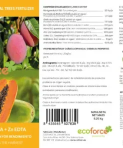 - Solución npk 3-1-7; aporte combinado de macronutrientes (nitrógeno, fósforo y potasio) y micronutrientes ( boro, calcio, hierro, maganeso, molibdeno y zinc) logra una nutrición más completa y balanceada; los aminoácidos favorecen la asimilación de los elementos y le otorgan una acción bioestimulante