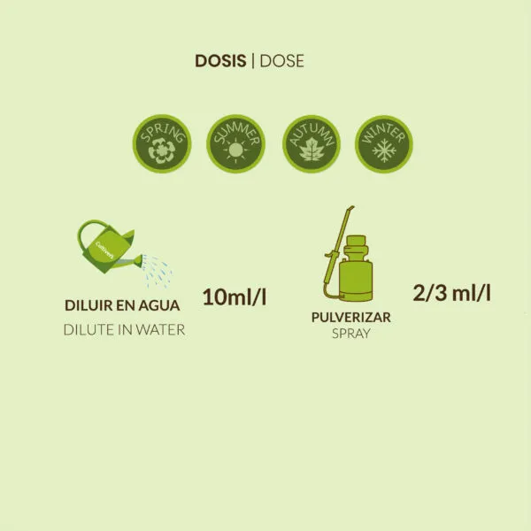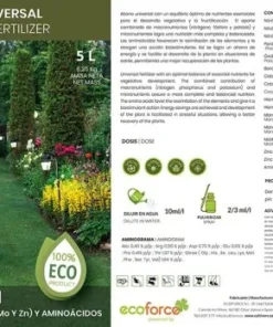 Fertilizante ecológico líquido universal para todo tipo de plantas interior e exterior. Plantas más sanas y vigorosas. Facilita el desarrollo de la planta en situaciones de estrés, permitiendo una mejor recuperación de las plantas. Equilibrio óptimo de nutrientes esenciales para el desarrollo vegetativo y la fructificación. Solución npk 4-1-7. Aporte combinado de macronutrientes (nitrógeno, fósforo y potasio) y micronutrientes ( boro, calcio, hierro, manganeso, molibdeno y zinc) logra una nutrición más completa y balanceada. Los aminoácidos favorecen la asimilación de los elementos y le otorgan una acción Bioestimulante. Producto 100% natural e inofensivo con los animales, respetuoso con el medio ambiente. Fertilizante ecológico universal líquido. Abono 100% orgánico y natural. Solución npk (4-1-7) con micronutrientes (b, cu, fe, mn, mo y zn) con aminoácidos.