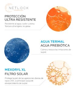 Propiedades: Extrema protección UVA/UVB. Ultra protección a UVA dada por un fotoprotector solar que contiene Mexoryl® SX y Mexoryl® XL (filtros solares patentados).
