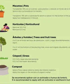 - Usos y Beneficios: Macetas (plantas más vigorosas y potencia la floración.) | Césped (más verde con menos agua). | Hortícolas (más producción, menos enfermedades). | Árboles (Mejora la resistencia a las enfermedades e impulsa su crecimiento. | Compost (acelera el proceso de compostaje, aumenta los nutrientes y los microorganismos)