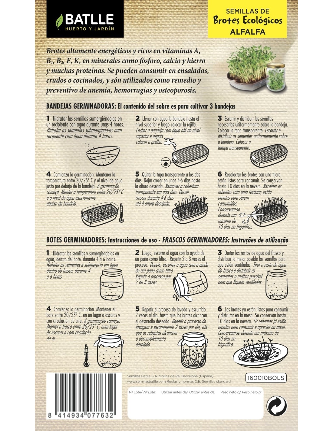 Ideales para cultivar en bandejas germinadoras o frascos de cristal, los brotes de alfalfa no requieren tierra, y germinan rápidamente. En apenas unos días podrás cosechar tus propios brotes frescos y crujientes directamente desde la cocina.