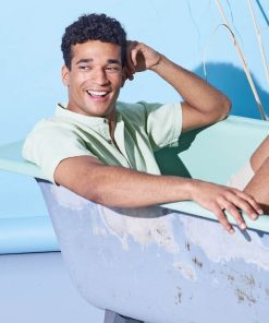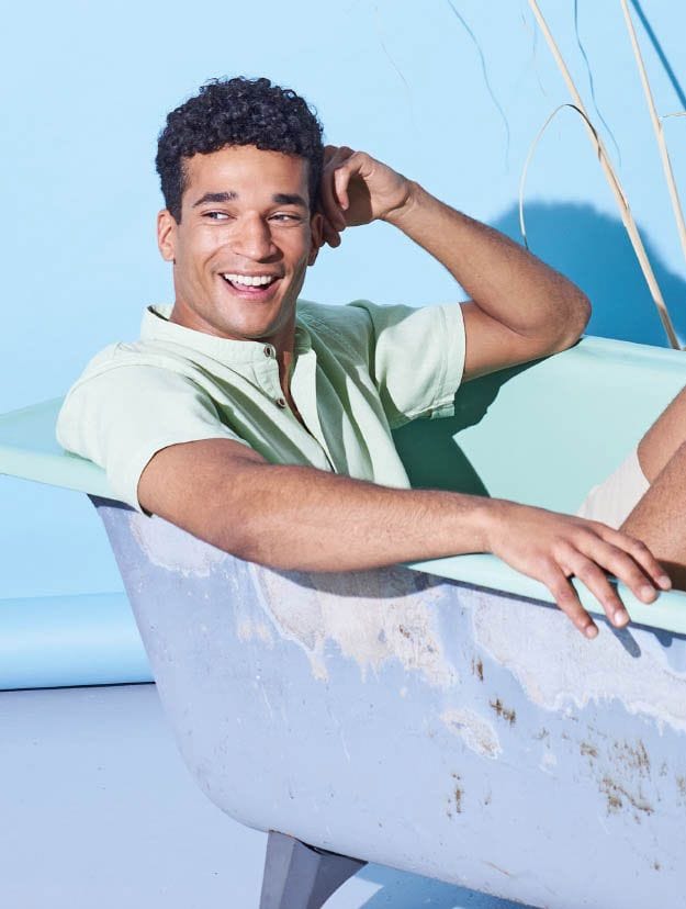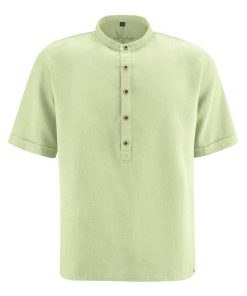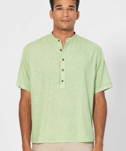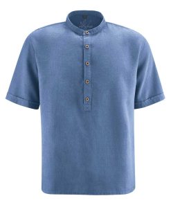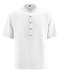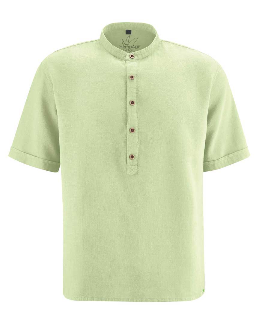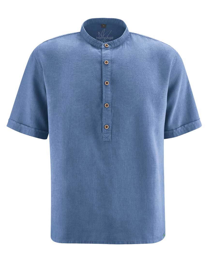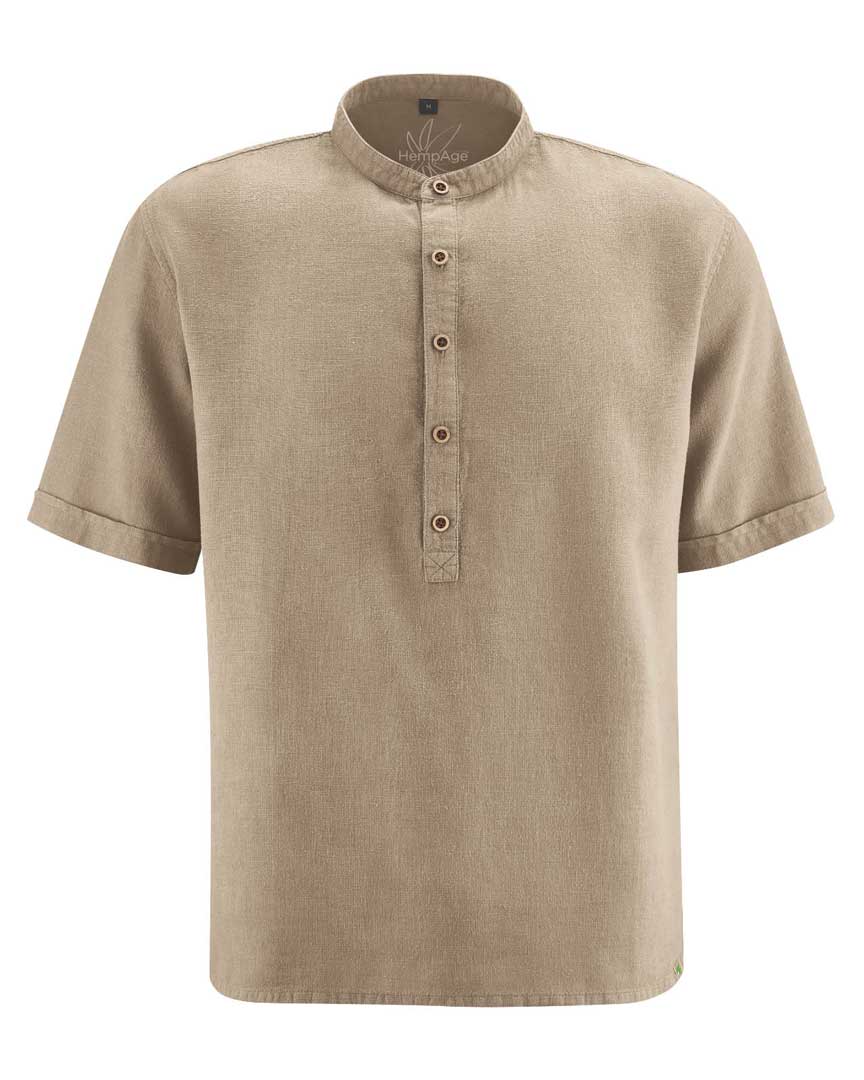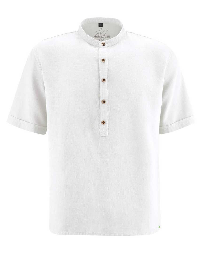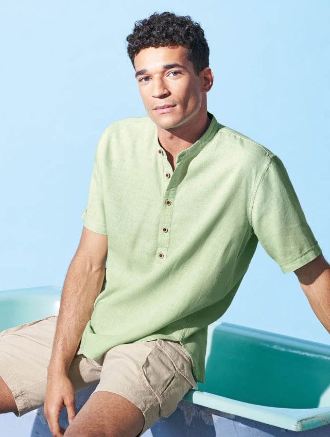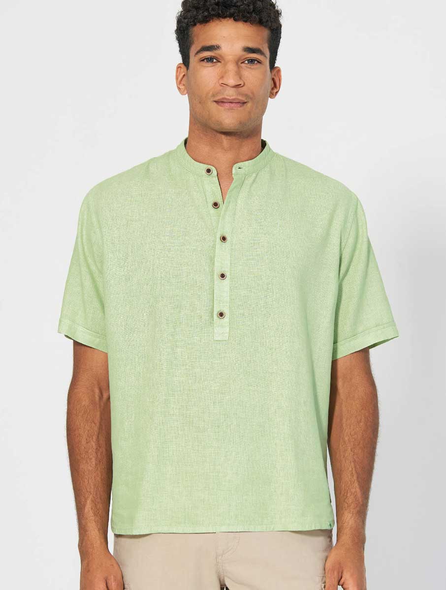 Esta camisa de cuello alzado para hombre presenta corte casual y tapeta con botones de coco. Ligera, vegana y antialérgica, ¡es perfecta para el verano!