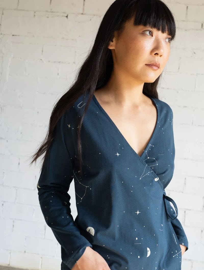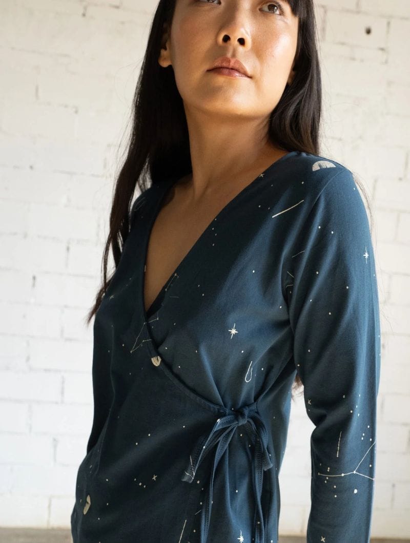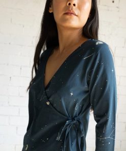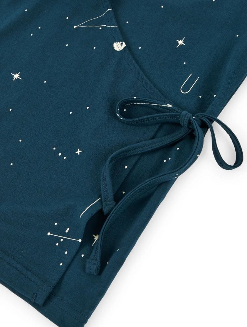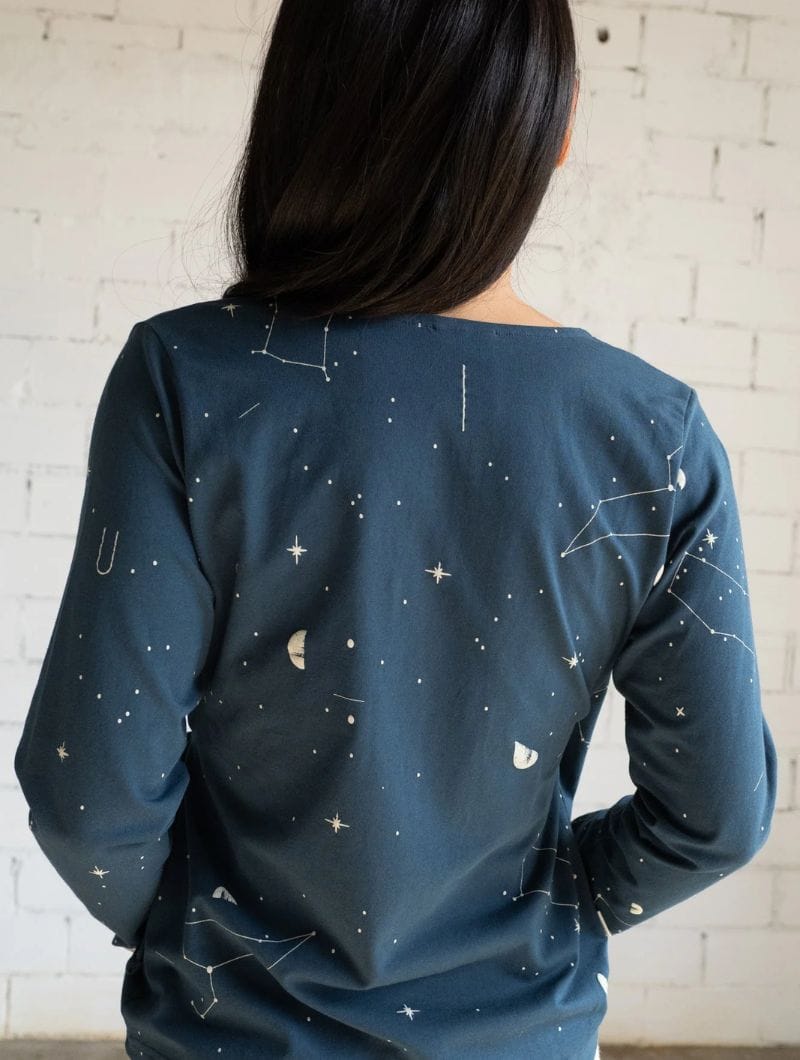 Atrévete a brillar con nuestra camiseta cruzada azul de constelaciones, perfecta para un look elegante y cómodo.