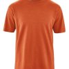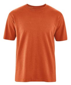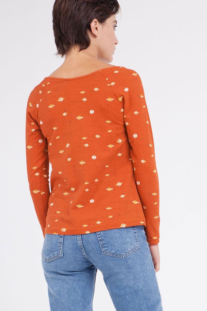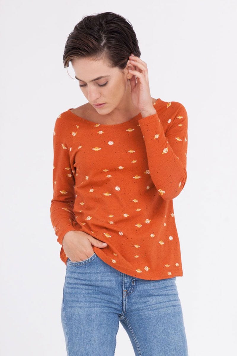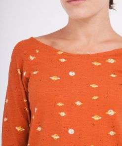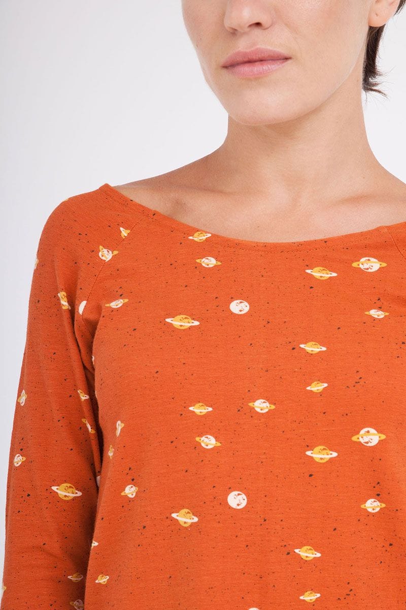 Camiseta cuello barco naranja con estampado de planeta Saturno.