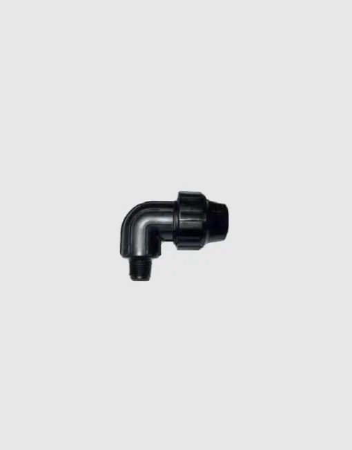 Codo rosca macho de polietileno de color negro especialmente diseñado para conectar una tubería de polietileno a distintos accesorios con rosca formando un ángulo de 90º. Cuenta con una rosca macho en un extremo y conexión a tubería en el otro.