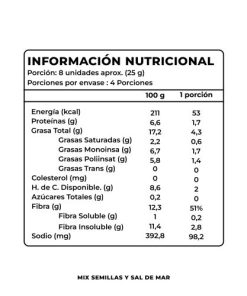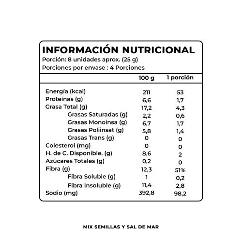 Contienen fibra de avena, un ingrediente excelente para la digestión. Las semillas de zapallo, semillas de maravilla, semillas de linaza y semillas de chía, aportan ácidos grasos esenciales y antioxidantes. El toque de sal resalta su sabor, mientras que el aceite de oliva proporciona grasas saludables y una textura crujiente única.