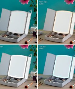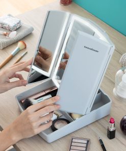Un original espejo LED plegable con organizador de maquillaje (multifunción 3 en 1) ideal para maquillarse cómodamente con una visión óptima. Por su diseño moderno, plegable y con varios compartimentos de almacenaje para utensilios y productos de maquillaje, permite ahorrar espacio y tener siempre a mano todo lo necesario para maquillarse fácilmente. Además, es muy versátil y adaptable, ya que funciona mediante USB (incluye cable USB a micro USB) o mediante pilas (no incluidas), según se prefiera en cada momento. Dispone de luz LED con control táctil y 3 modos de iluminación (luz fría, luz cálida, luz diurna). Este espejo de sobremesa panorámico y portátil cuenta con un espejo central y dos hojas laterales que se pliegan y despliegan con facilidad. También incluye un mini espejo deslizante en la parte trasera con aumento x7 para una visión aumentada de la zona facial deseada. Cuenta con unos pequeños pies antideslizantes para una firme sujeción.