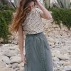 Esta falda hasta la rodilla es muy suave y agradable al tacto. Cuenta con bolsillos de plastrón, botones de coco y una goma a la cintura en la parte trasera para un ajuste perfecto.
