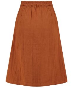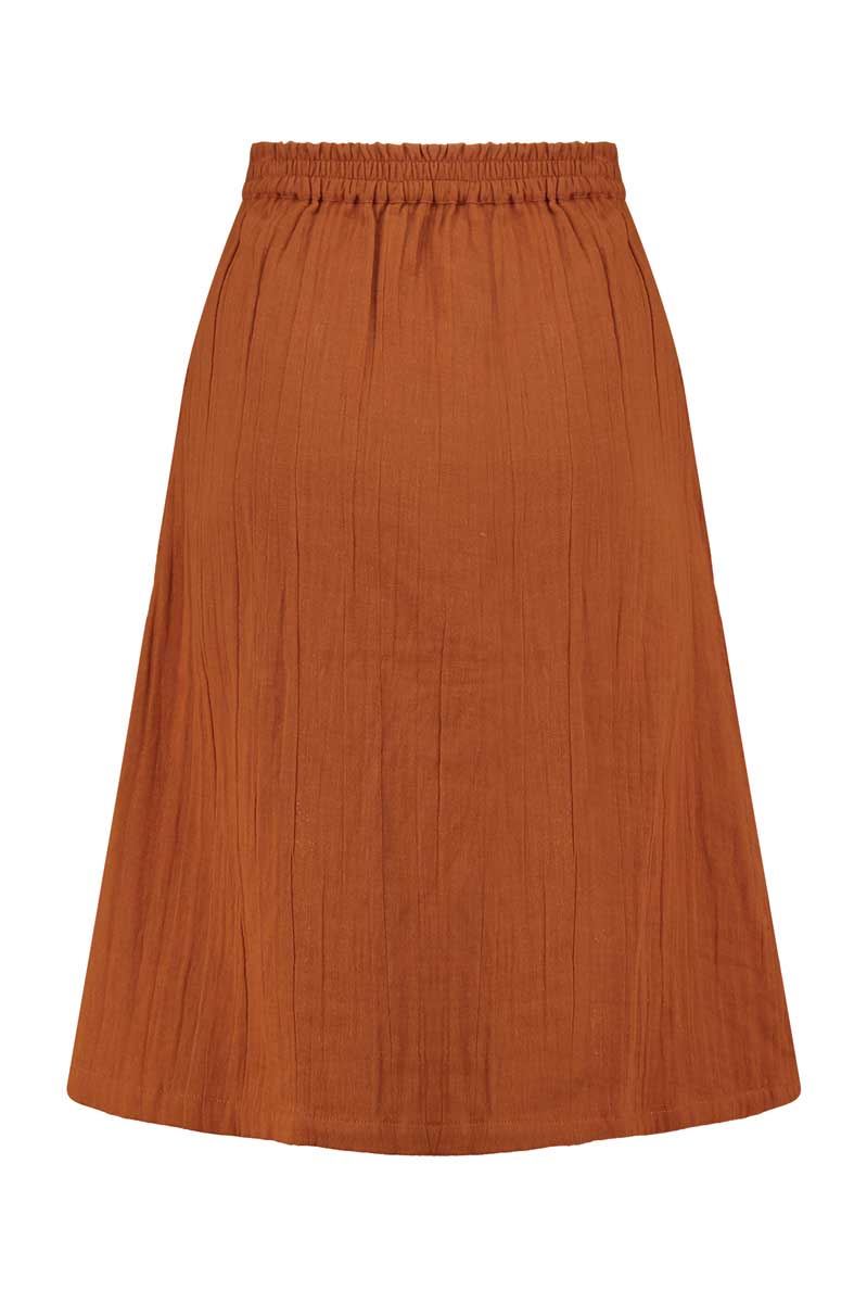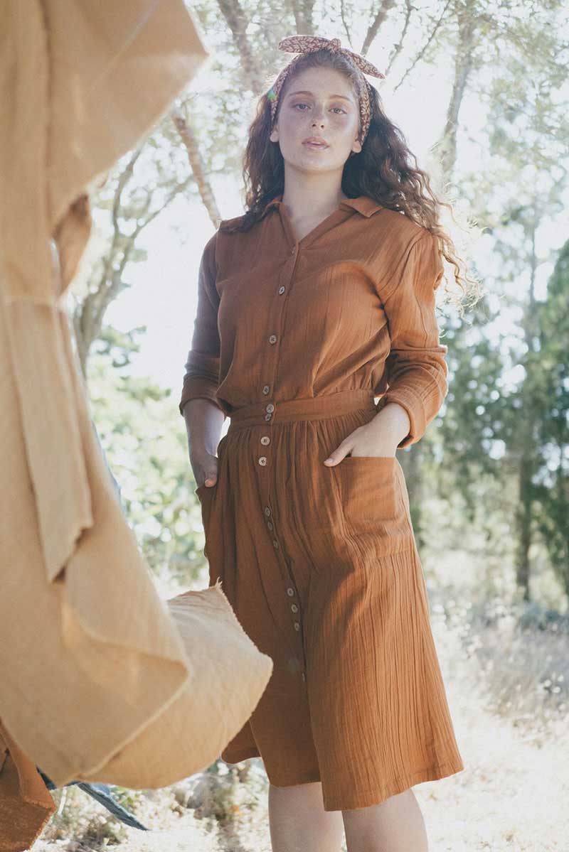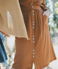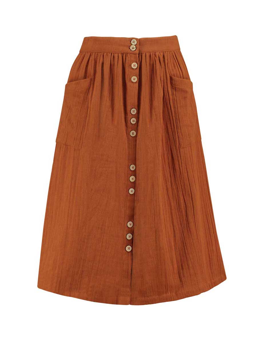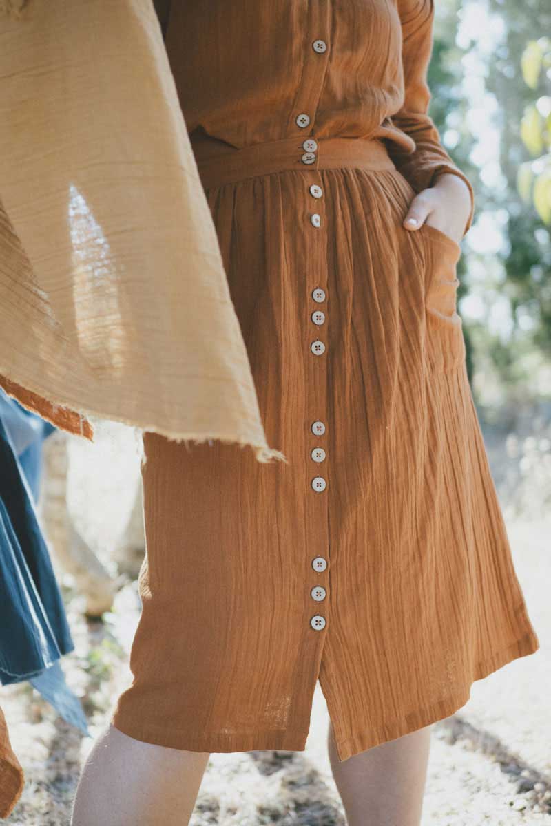Está fabricada en 100% algodón orgánico con certificado GOTS y tintes ecológicos. La falda con botones color teja es una prenda sostenible respetuosa con el medio ambiente y con los derechos humanos.