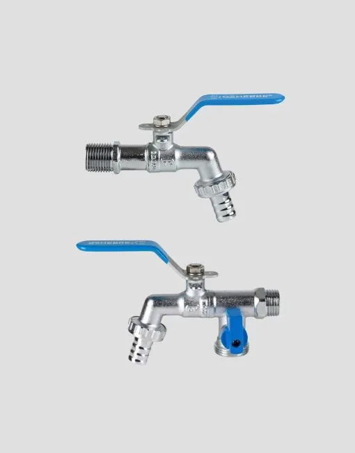 Grifo curvo de latón con válvula de esfera para manguera, entrada rosca GAS M y salida racor dos piezas para conexión manguera. Este grifo curvo con palanca resulta ideal para acoplar tanto mangueras como programadores de riego.