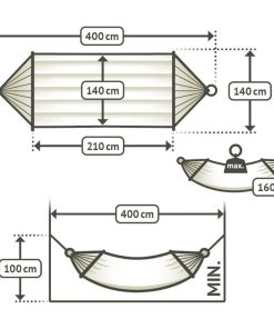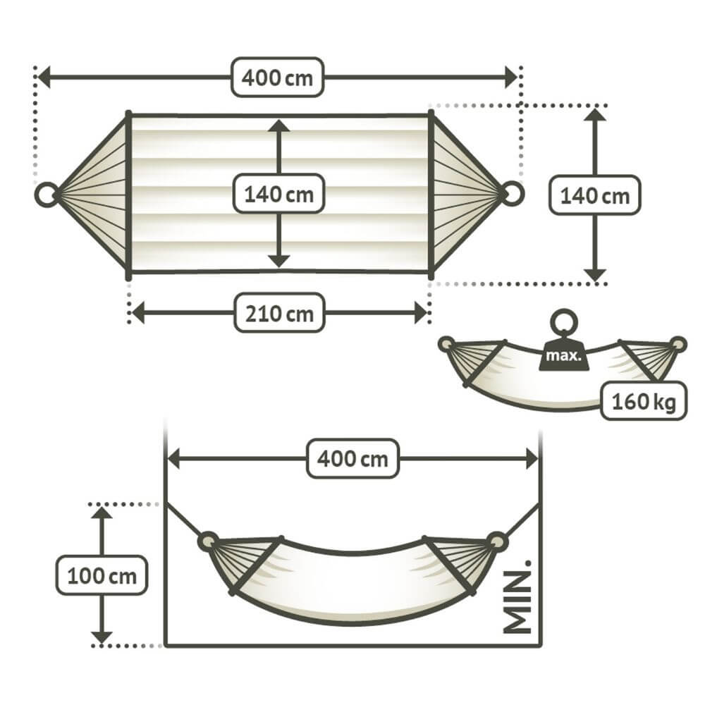 Al colgar una hamaca con barra se tiene que pensar ante todo en colgarla tensa. Cuanto más tensa se cuelgue la hamaca más cómodo será tumbarse. Para una hamaca con barra se necesita algo más de distancia que para una hamaca sin barra. La altura de sujeción (y) debería elevarse ¼ de la distancia de sujeción (x). Para una hamaca de cuatro metros de longitud se necesita una altura de sujeción de aproximadamente un metro. Si la hamaca es más pequeña se necesita menos distancia y altura. |