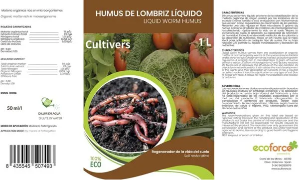 El HUMUS DE LOMBRIZ proviene de la estabilización de la materia orgánica de origen animal por las lombrices de la especie Eisenia foetida y está enriquecido con fitohormonas que actúan como reguladores de crecimiento de las plantas. Presenta una alta riqueza en flora microbiana (1 gramo de humus contiene alrededor de 2 billones microorganismos) reestableciendo rápidamente la vida en el suelo. Mejora la estructura del suelo, la aireación, su capacidad de retención de humedad. Estimula el desarrollo radicular de las plantas y su absorción de nutrientes. Posee un pH neutro que lo hace ideal para aplicarlo en cualquier tipo de suelos. Producto exento de Salmonela sp, Escherichia coli y carente de metales pesados. Producto exento de Salmonela sp, Escherichia coli y carente de metales pesado. La aplicación continuada de humus de lombriz mejora las propiedades del suelo, lo que se traduce en un aumento en la calidad y producción de las cosechas. El humus de lombriz tiene una alta actividad microbiana que mejora el crecimiento de las plantas. Presenta un efecto supresivo contra nematodos y otros agentes fitopatógenos. El humus de lombriz posee la capacidad para modificar la extractabilidad de metales pesados, el comportamiento (adsorción, degradación) de plaguicidas en el suelo y regenerar suelos degradados.