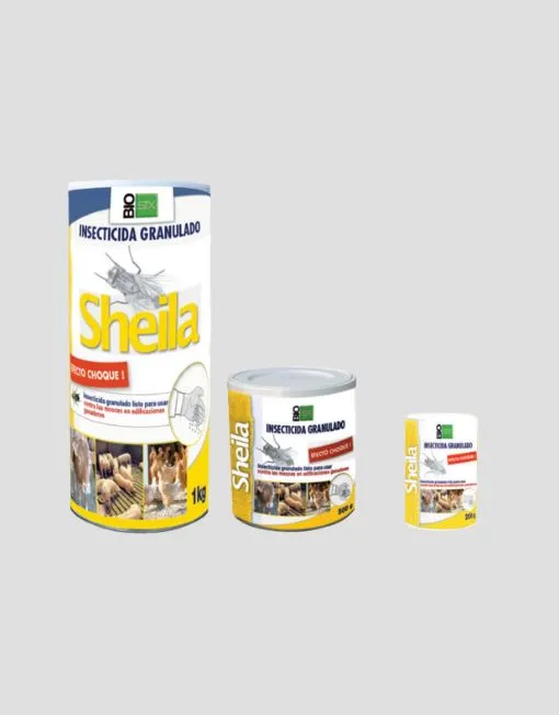 - Granulado de Fácil Uso: SHEILA se presenta en forma de granulado amarillo que contiene azametifós y cebo alimentario. Puede utilizarse en pequeños recipientes, esparcirse o aplicarse verticalmente en soportes amarillos.