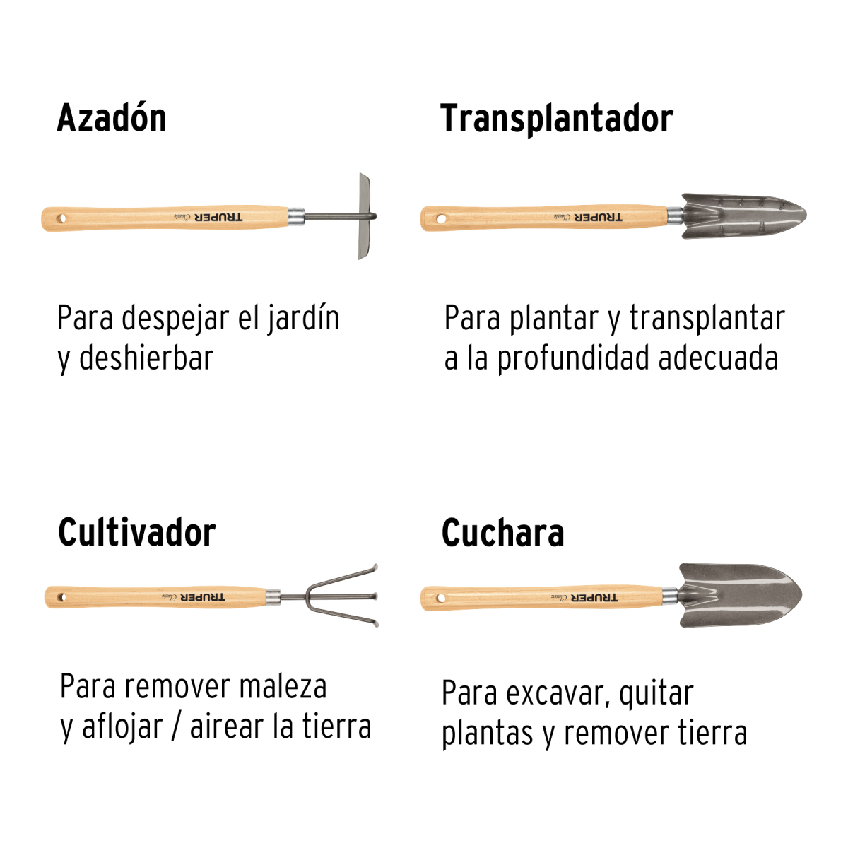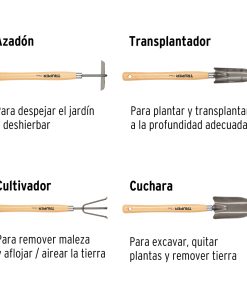 El juego de herramientas para jardín de la marca Truper, es la solución perfecta para cualquier aficionado o profesional de la jardinería. Este set incluye cuatro herramientas esenciales, cada una diseñada con cabezas de acero al carbono de alta resistencia y mangos de madera ergonómicos de 12 1/4″ pulgadas, ideales para realizar todas las tareas básicas de jardinería con eficiencia y comodidad.
