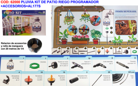 Kit patio de riego pluvia por aspersión con programador manual y accesorios incluidos.