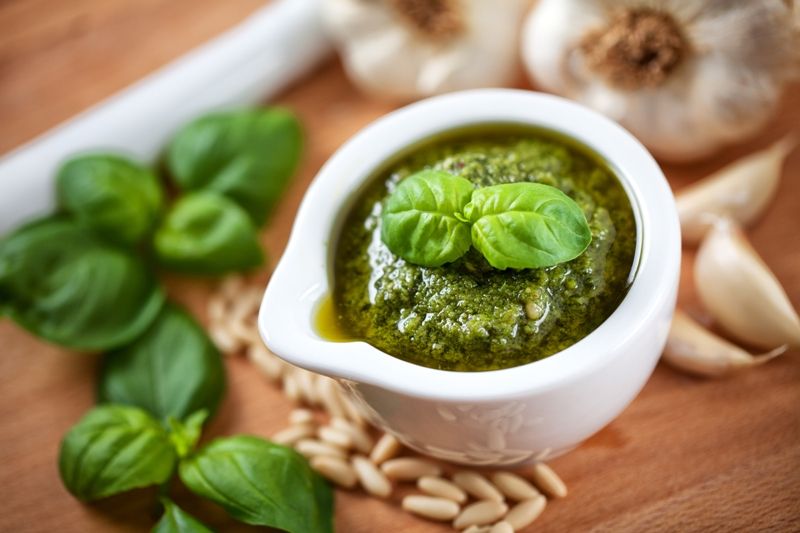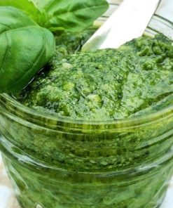 Pesto a base de albahaca, nueces y ajo. Ideal para hidratar con el aceite que más te guste y utilizar en tus pastas o salsas.