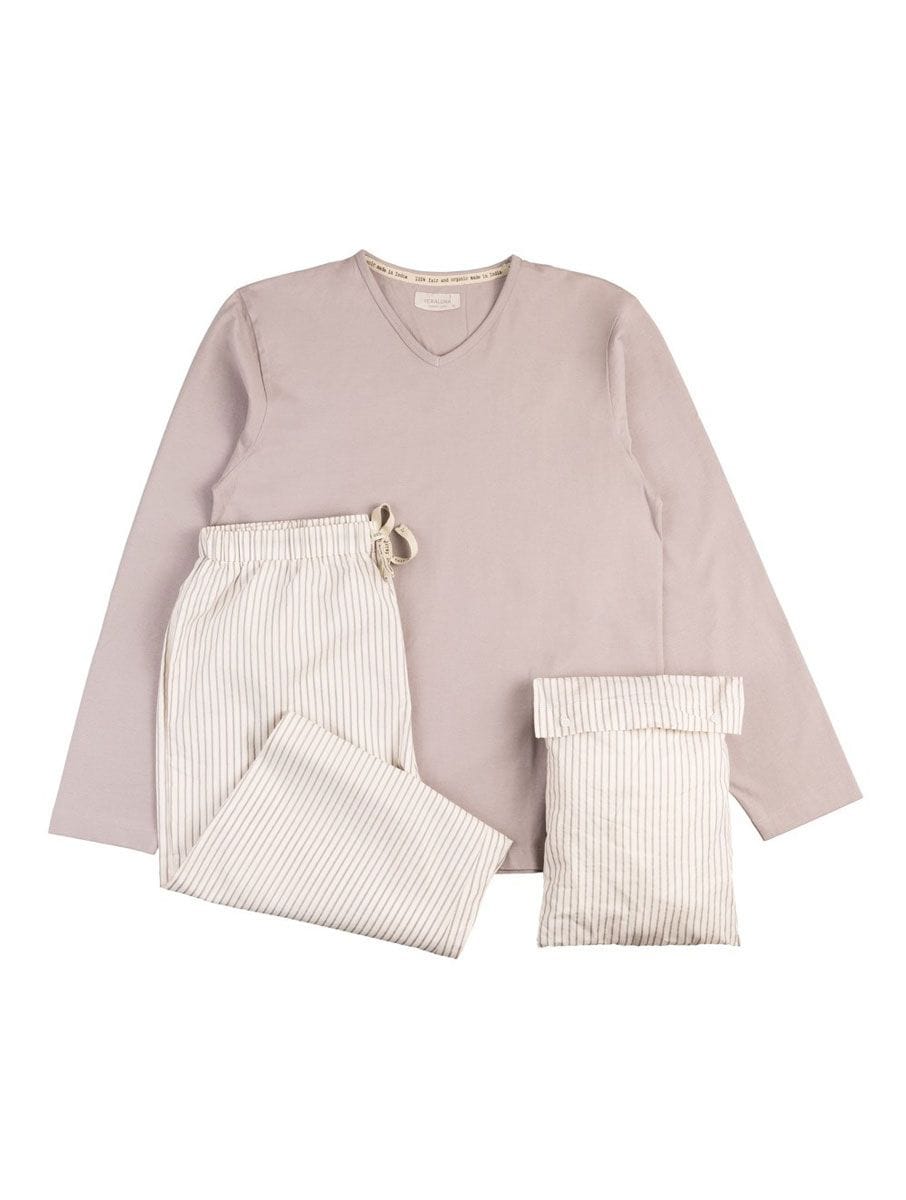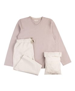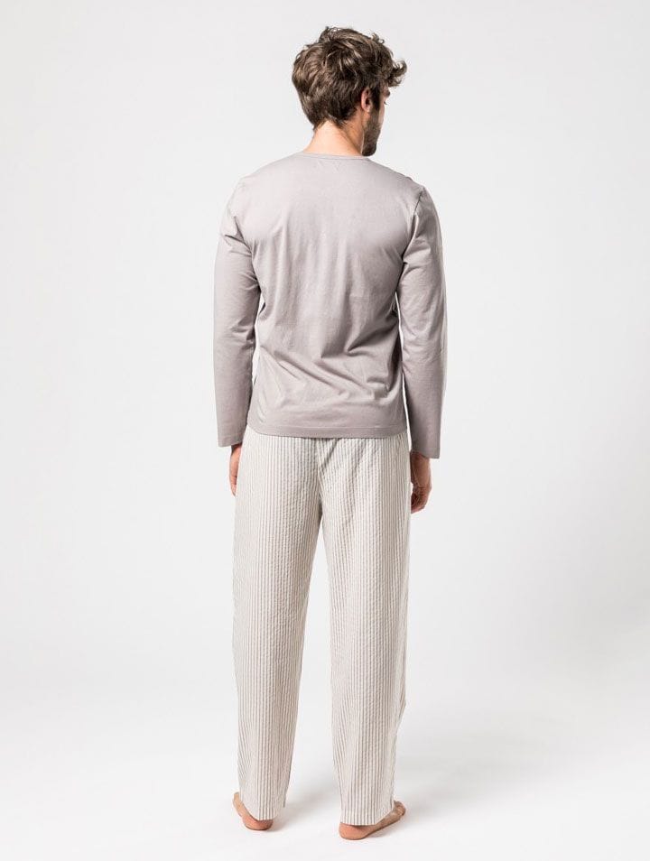 Este pijama ecológico para hombre es muy suave y cómodo. Cuenta con una camiseta gris de cuello en pico y unos pantalones en color crudo con rayas grises. Se ajusta a la cintura con cierre de cordón.