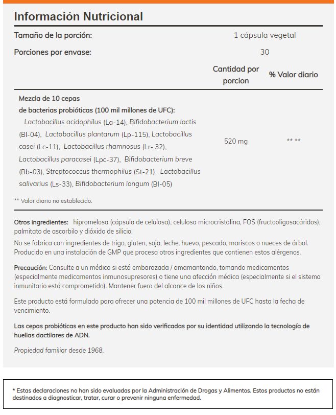 Probiotic-10 – 100 Billones 30 cápsulas veg. marca Now