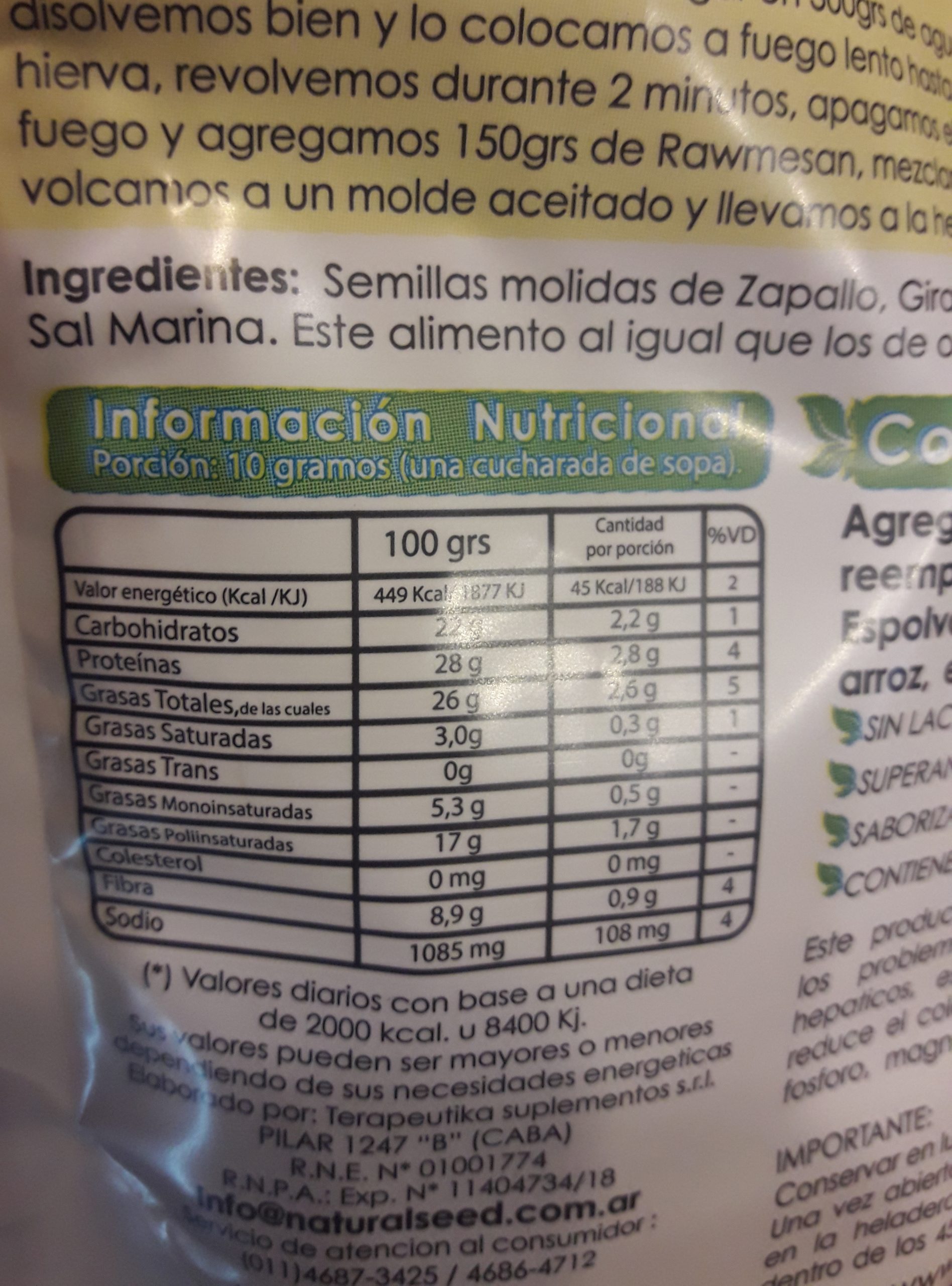 Semillas molidas de zapallo, girasol, cúrcuma, levadura y sal marina.