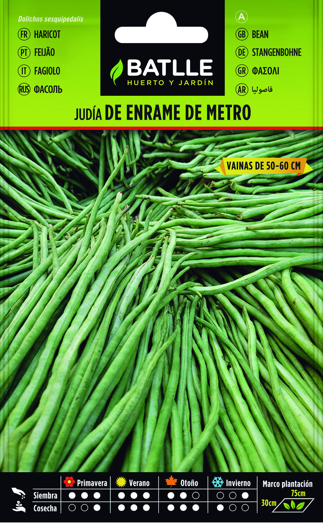Judía de metro, de enrame, nueva selección que produce vainas rectas de extraordinaria longitud: 60 – 70 cm, de sección redonda, color verde medio. De vegetación muy vigorosa. Ciclo medioprecoz. Grano negro.