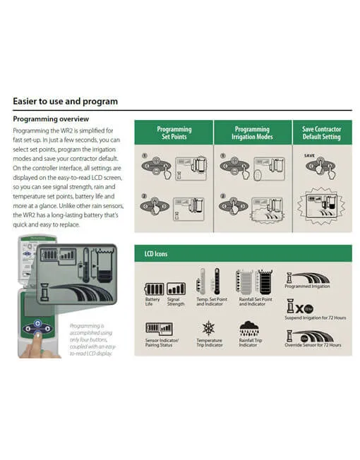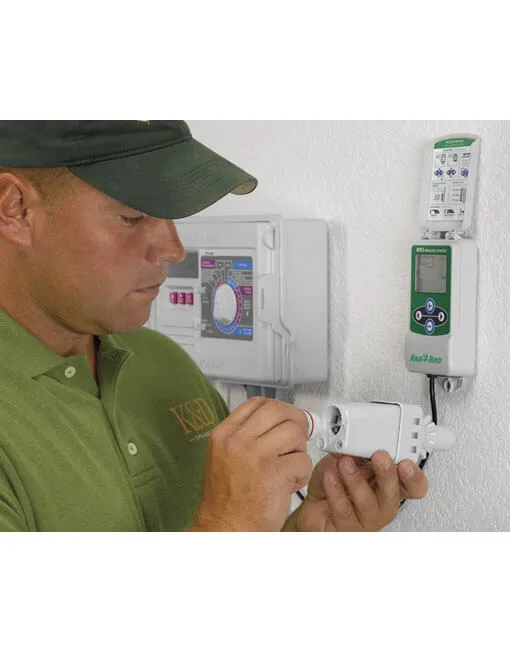 - Ahorra agua y prolonga la vida útil del sistema de riego detectando automáticamente las precipitaciones e interrumpiendo el riego durante periodos de lluvia y/o con temperaturas extremadamente bajas.