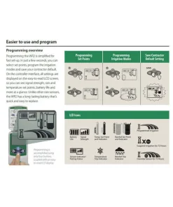 Se trata de un dispositivo inteligente para la cancelación del riego, ya que la lógica de programación del WRS puede suspender el riego cuando la lluvia caída supera una cantidad programada. Del mismo modo, el sensor inalámbrico de lluvia y heladas suspenderá el riego cuando el sistema alcance una temperatura inferior a la temperatura programada.