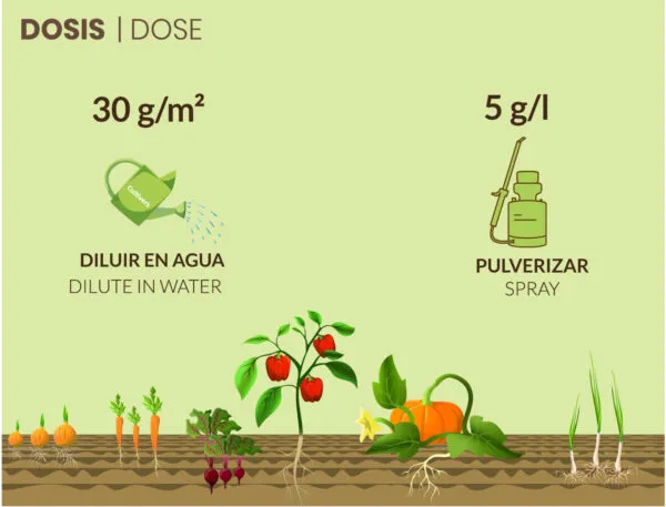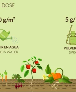 - Mejora la calidad del suelo, aumentar la producción de vegetales, acelerar el crecimiento y mayor floración. Especial para Tomates y Pimientos por su gran consumo de magnesio mientras crecen.