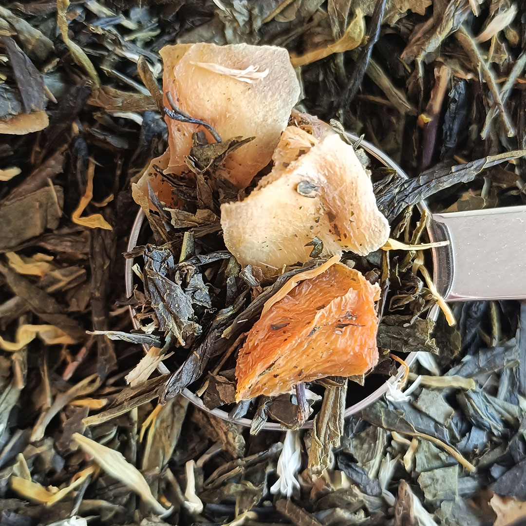 Ingredientes de té verde elixir francés: Té verde, trozos de mango, flores de aciano, flores de caléndula y aroma de mango y de mirabel.