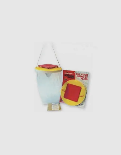 Trampa Mini Trap de usar y tirar, lista para colgar y preparada para atraer moscas en recintos exteriores. Permite que entren, quedando atrapadas.