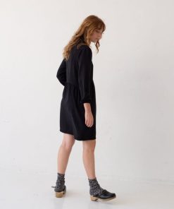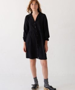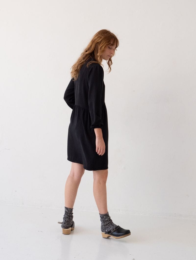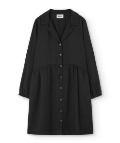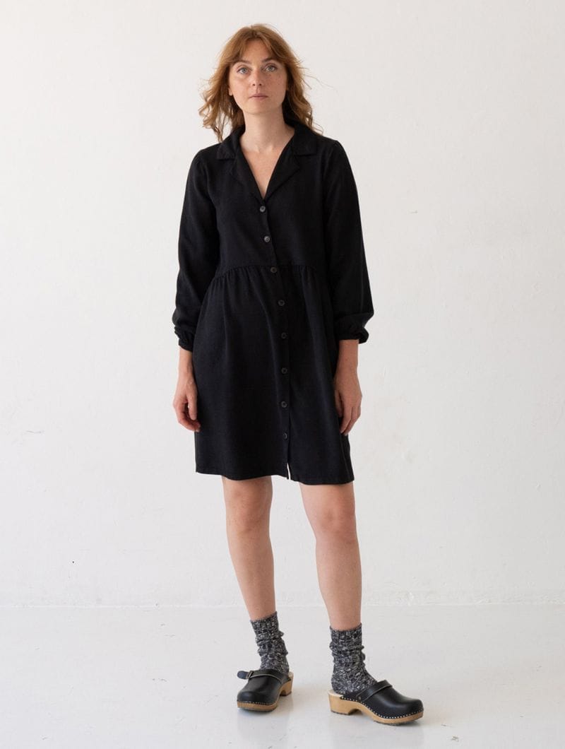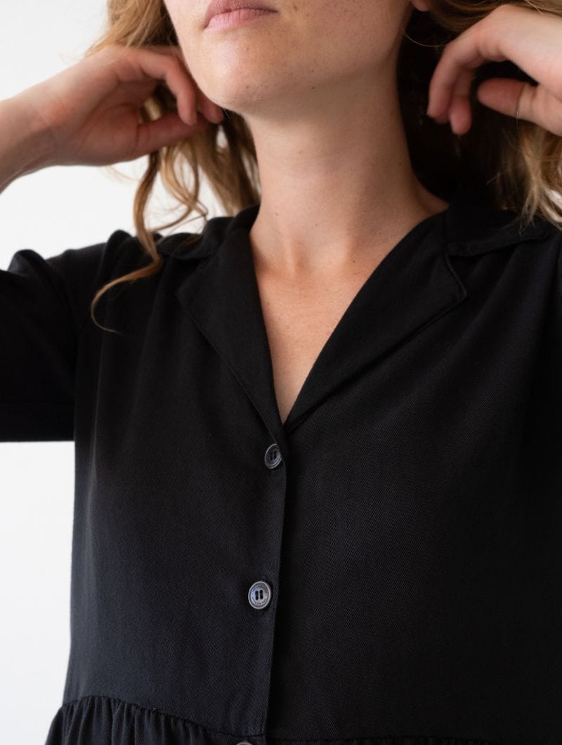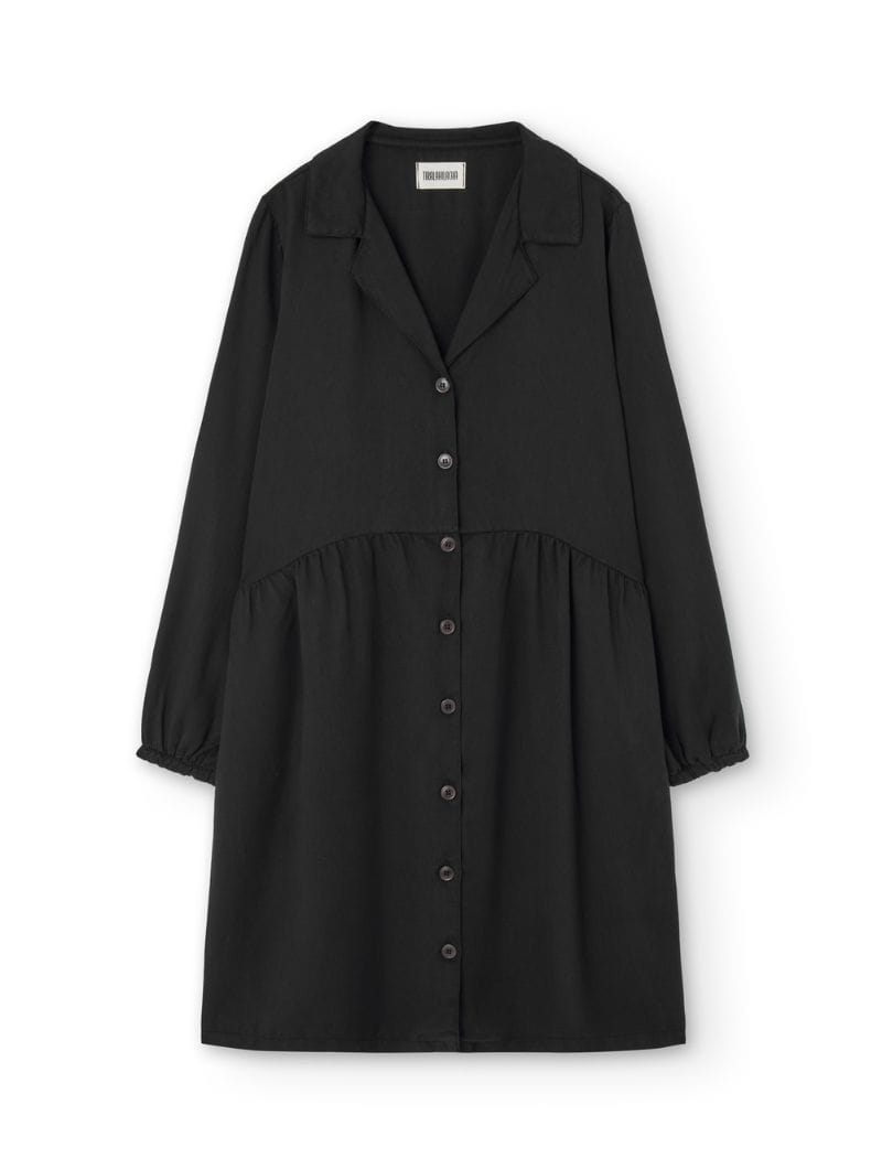 Vestido tencel negro abotonado de corte oversized, con cuello camisero y botones de corozo al tono. Suave, ligero y cómodo, ideal para combinar en looks casuales o más formales.