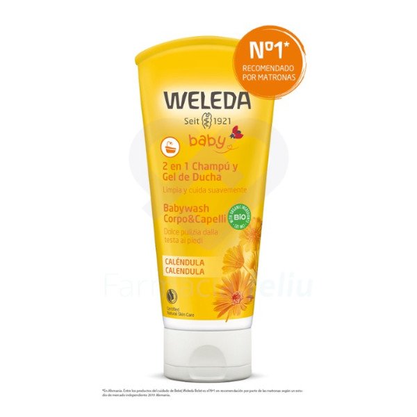 Weleda Champú y Gel de Ducha Caléndula sin jabón de alta tolerancia para la limpieza del cabello y piel del bebé.